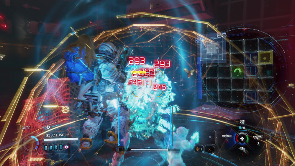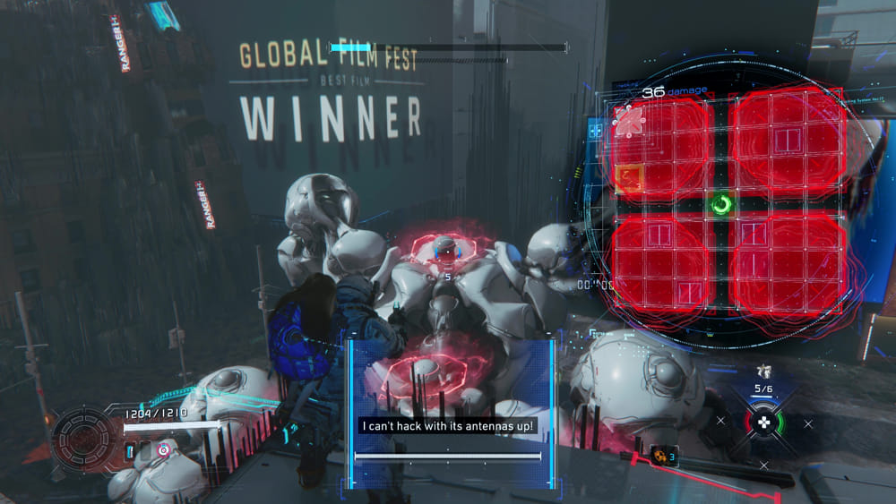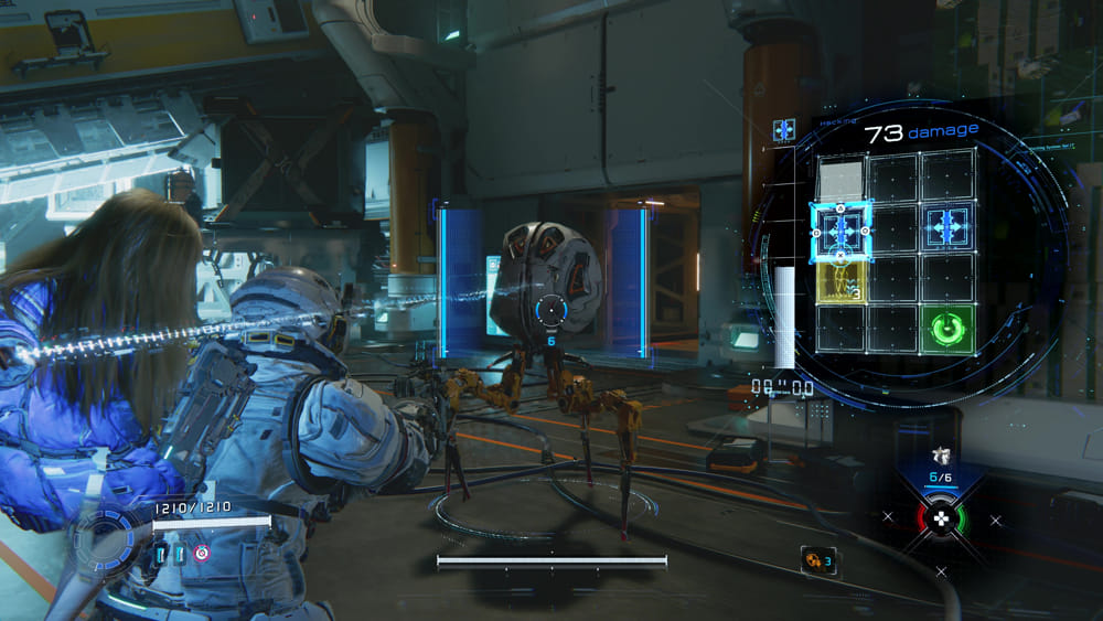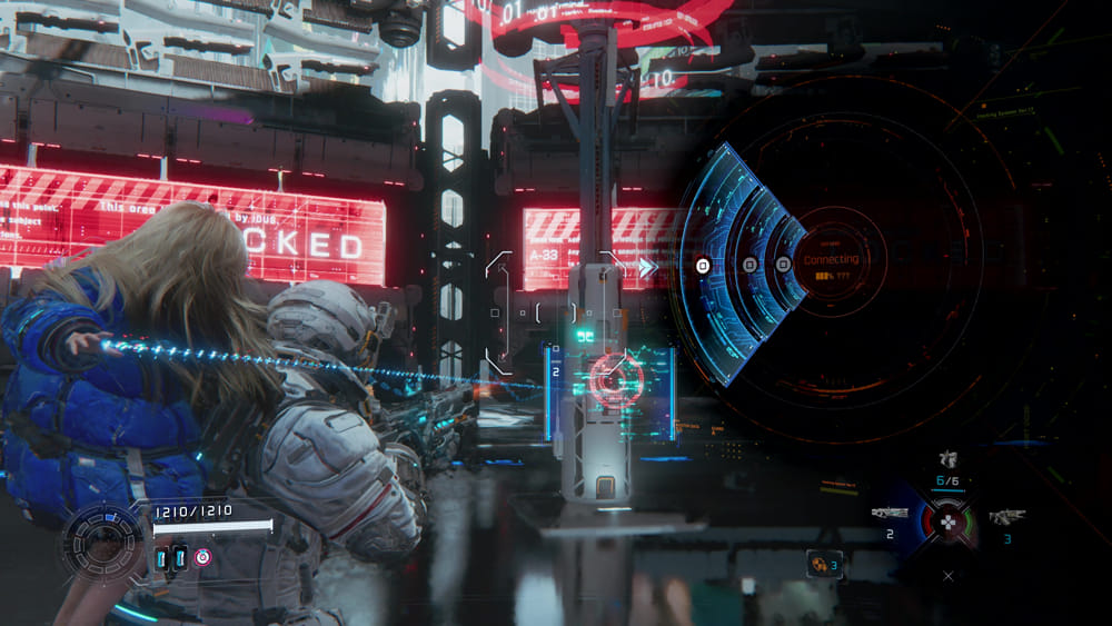 แผง hacking ประกอบด้วยโหนดต่างๆ ที่ผู้เล่นต้องใช้เคอร์เซอร์นำทางไปให้ถึงจุดสิ้นสุดสีเขียว ยิ่งเชื่อมต่อโหนดสีน้ำเงินได้มากเท่าไหร่ เอฟเฟกต์ของการ hacking ก็จะยิ่งมากขึ้นเท่านั้น ทั้งในแง่ของความเสียหายและระยะเวลา อย่างไรก็ตาม การเชื่อมต่อโหนดสีน้ำเงินทั้งหมดไม่จำเป็นเสมอไป ดังนั้นผู้เล่นจึงต้องประเมินสถานการณ์อย่างรวดเร็วและตัดสินใจเลือกเส้นทางที่ดีที่สุด