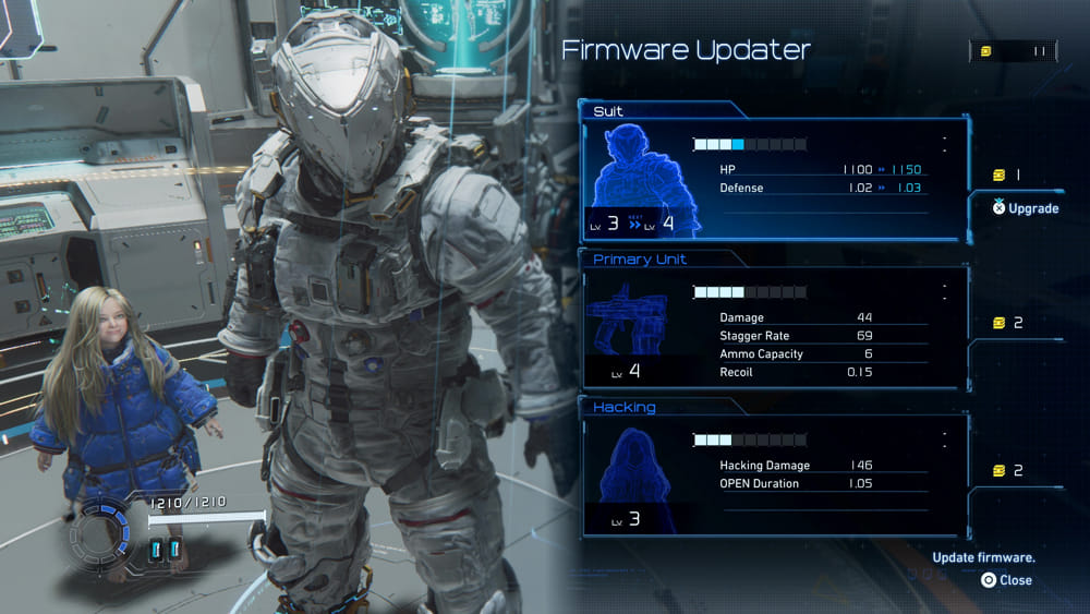 ในการเพิ่มค่าสถานะ ผู้เล่นสามารถใช้ Upgrade Components ซึ่งเป็นลูกบาศก์สีเหลืองที่พบระหว่างการสำรวจ ส่วนประกอบเหล่านี้สามารถนำไปจัดสรรให้กับสามส่วนหลัก ได้แก่ ความเสียหายอาวุธของ Hugh, การป้องกันของชุดของ Hugh และความสามารถในการ hacking ของ Diana