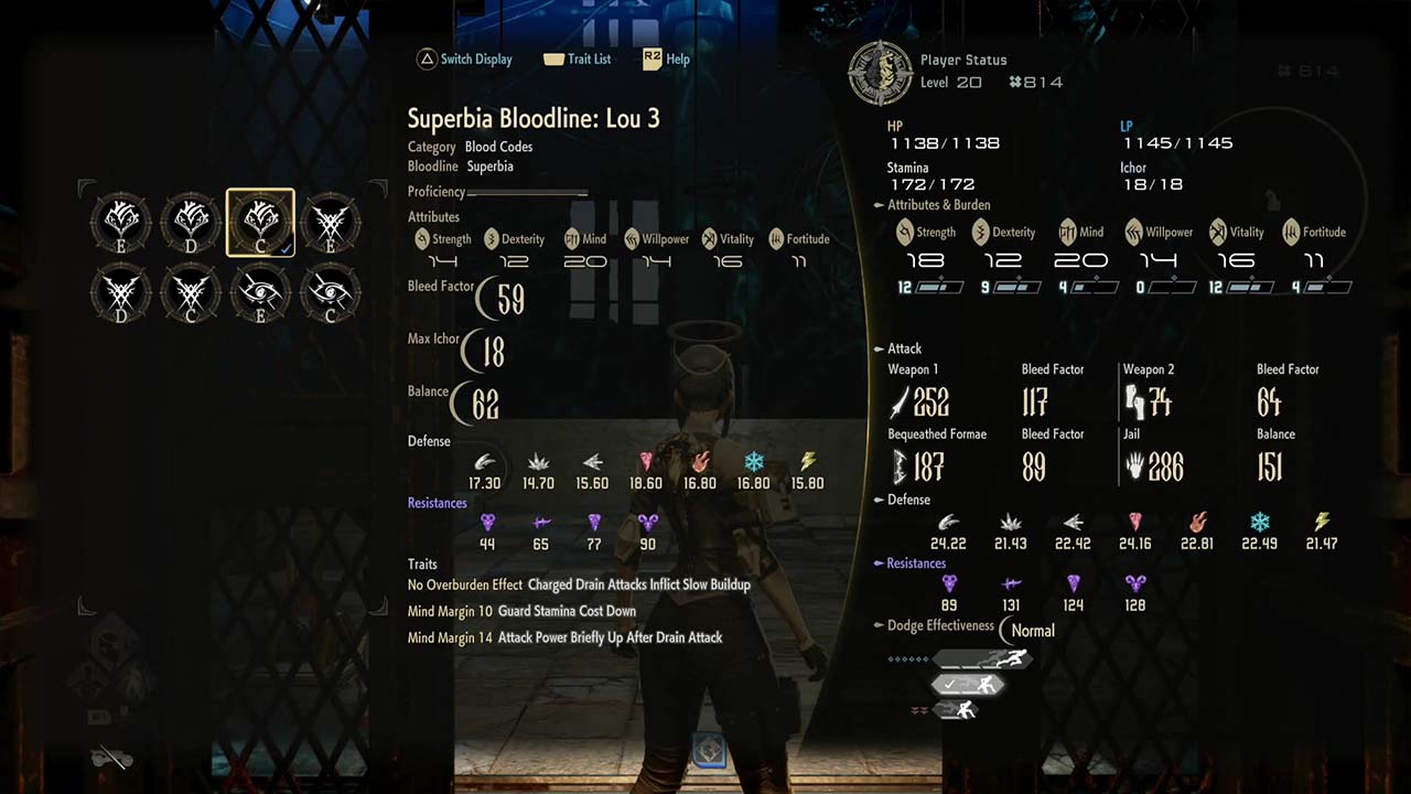 Blood Code กลับมาเป็นแกนหลักของระบบการต่อสู้เช่นกัน โดยทำหน้าที่เหมือนคลาส กำหนดค่าสถานะสำคัญ เช่น Strength, Dexterity, Mind, Willpower, Vitality และ Fortitude ค่าสถานะเหล่านี้มีอิทธิพลต่อการใช้อาวุธ อุปกรณ์ และประสิทธิภาพโดยรวมของตัวละคร ซึ่งแตกต่างจากระบบ Souls ที่มีการจัดสรรคุณลักษณะอย่างอิสระ ผู้เล่นสามารถเปลี่ยน Blood Code เพื่อเปลี่ยนรูปแบบการเล่น ได้ทันที