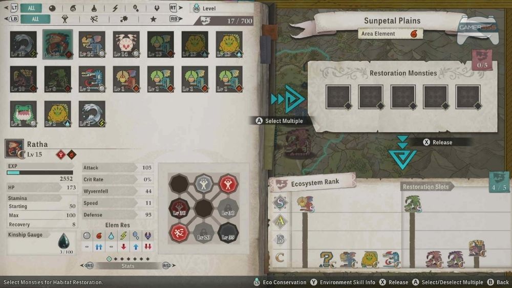Habitat Restoration อยู่ที่หัวใจของ Monster Hunter Stories 3: Twisted Reflection ความก้าวหน้าไม่ได้ถูกขับเคลื่อนด้วยการได้ Monsties ที่แข็งแกร่งกว่าเพียงอย่างเดียวอีกต่อไป แต่โดยการสร้างระบบนิเวศที่เสียหายขึ้นใหม่ ผู้เล่นฟัก Monsties และปล่อยพวกมันกลับคืนสู่ป่า เพิ่มระดับสายพันธุ์ในภูมิภาคซึ่งมีอิทธิพลโดยตรงต่อคุณภาพไข่, ความพร้อมใช้งานของสกิล และคุณสมบัติธาตุ