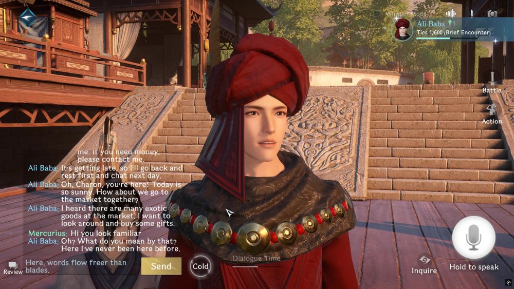 NPC บางตัวยังรองรับการสนทนาด้วยภาษาธรรมชาติ โดยตอบสนองต่อบทสนทนาที่ป้อนเข้าไปอย่างอิสระได้อย่างชาญฉลาด เมื่อผมบอก NPC คนหนึ่งว่า “คุณดูคุ้นๆ นะ” เขาตอบว่า “จริงเหรอ? เจ้าเคยเห็นข้าที่ไหนมาก่อน?” ผมตอบว่า “อาจจะในหนังสือนิทาน” และเขาตอบกลับว่า “แล้วข้าเป็นตัวละครแบบไหนในเรื่องของเจ้าล่ะ?” การแลกเปลี่ยนบทสนทนาเหล่านี้ลื่นไหลเป็นธรรมชาติมากจนแทบจะทำให้เส้นแบ่งระหว่างเกมและความเป็นจริงเลือนลางไป