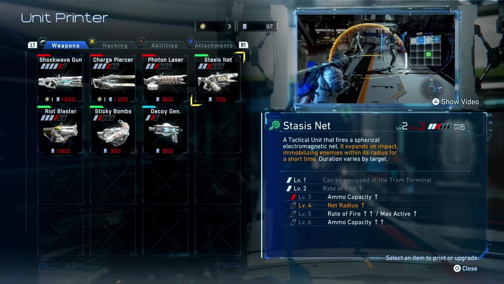 แต่ละหมวดหมู่มีบทบาทของตนเองและสามารถปรับเปลี่ยนให้เข้ากับสไตล์การเล่นของคุณได้ ความจุจะเพิ่มขึ้นเมื่อคุณเล่นไปเรื่อยๆ แต่คุณจะไม่สามารถใช้อาวุธชนิดเดียวกันซ้ำได้สองครั้ง