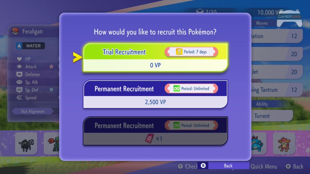 คุณสามารถรับสมัครโปเกมอนได้อย่างถาวรในราคา 2,500 VP หรือใช้ตั๋วรับสมัครถาวรหนึ่งใบ เนื่องจากฝึกฝนโปเกมอนก็ต้องใช้ VP จำนวนมากเช่นกัน เราขอแนะนำให้คุณประหยัด VP และใช้ตั๋วรับสมัครเมื่อเป็นไปได้ หากคุณใช้ VP ไปกับการรับสมัครมากเกินไปในช่วงต้นเกม คุณอาจไม่มีทรัพยากรเหลือสำหรับการฝึกฝน