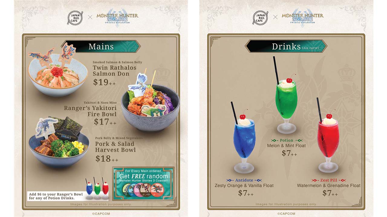 เมนูพิเศษจากการร่วมมือครั้งนี้ใช้ชื่อว่า Twin Flavor และนำเสนอเมนูข้าว 3 เมนู ได้แก่ Twin Rathalos Salmon Don, Pork & Salad Harvest Bowl และ Ranger’s Yakitori Fire Bowl นอกจากนี้ยังมีตัวเลือกเครื่องดื่ม 3 ชนิด ได้แก่ Antidote, Potion และ Zest Pill ให้เลือกสั่งเพื่อเติมเต็มมื้ออาหาร การสั่งเมนูพิเศษแต่ละรายการจะมาพร้อมกับไม้จิ้มอาหาร แบบสุ่ม ในขณะที่ลูกค้าที่สั่งเมนูข้าวเมนูใดเมนูหนึ่งจะได้รับที่รองแก้วลายตัวละครรุ่นลิมิเต็ด 1 ลายจากทั้งหมด 5 ลาย ซึ่งจะถูกสุ่มแจกให้เช่นกัน
