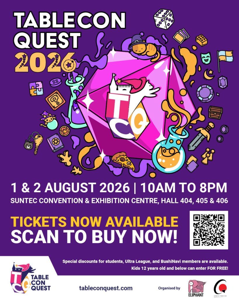 TableCon Quest (TCQ) ได้รับการประกาศอย่างเป็นทางการแล้วว่าจะกลับมาจัดอีกครั้งตั้งแต่วันที่ 1 ถึง 2 สิงหาคม โดยยังคงจัดขึ้นที่ Suntec Convention & Exhibition Centre ซึ่งตอนนี้ได้เปิดจำหน่ายตั๋วอย่างเป็นทางการแล้ว งานนี้ซึ่งจัดขึ้นเป็นปีที่สาม จะมีกิจกรรมที่น่าตื่นเต้นมากมาย โดยเน้นไปที่การ์ดเกม บอร์ดเกม และเกมเทเบิลท็อป ผู้จัดงานยังสนับสนุนให้ผู้เข้าร่วมงานจองตั๋วผ่านหน้า Eventbrite