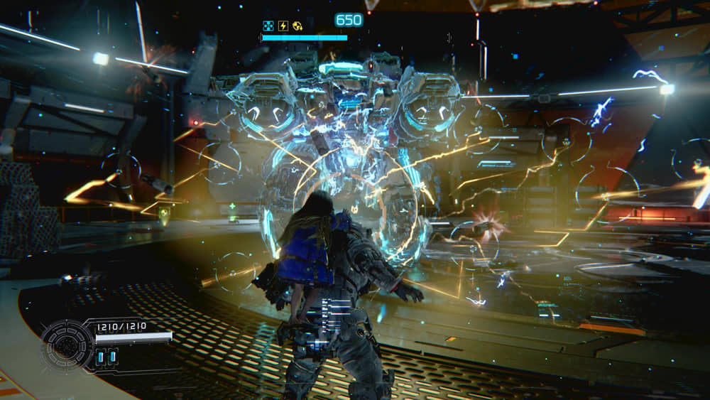 เดโมยังเปิดโอกาสให้เราได้ลองต่อสู้กับมินิบอสอีกด้วย ศัตรูมีรูปแบบการโจมตีที่หลากหลาย ตั้งแต่การพุ่งชนและการระดมยิงไปจนถึงการกระแทกพื้นซึ่งสามารถทำให้ตัวละครมึนงงได้ ความท้าทายอยู่ที่การที่เราต้องมีสมาธิกับการหลบหลีกในขณะที่ทำกระบวนการแฮ็กให้เสร็จสิ้น