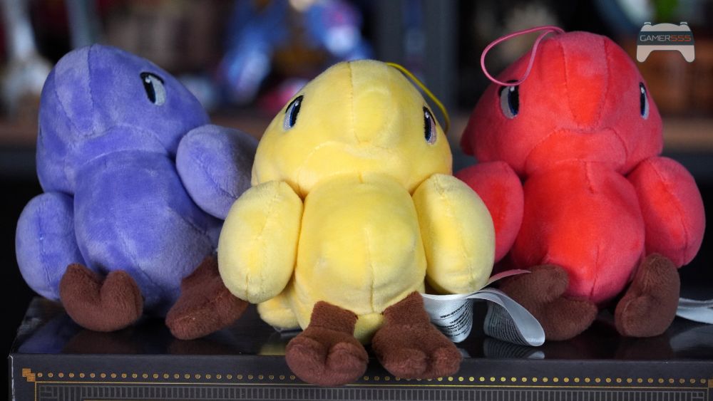 ถัดจากฟิกเกอร์คือเซอร์ไพรส์ที่น่าสนใจอีกอย่าง: ตุ๊กตา Chocobo ขนาดเล็กสามตัวในสีเหลือง, สีม่วง และสีแดง พวกมันนุ่มนิ่มน่ากอด นำเสนอนกจาก Final Fantasy Tactics แต่ละตัวในการออกแบบที่เรียบง่ายแต่เป็นเอกลักษณ์ ตุ๊กตาแต่ละตัวยังมีห่วงยางยืด คุณจึงสามารถใช้เป็นที่ห้อยกระเป๋าหรือตั้งโชว์บนหิ้งได้