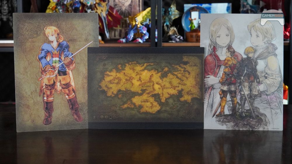 และสุดท้าย มีซองจดหมายที่บรรจุภาพพิมพ์อาร์ตเวิร์กสามภาพ พิมพ์บน PP (โพลีโพรพีลีน) ที่ทนทานและมันวาว ผลลัพธ์ที่ได้ดูพรีเมียมและเหมาะสำหรับการใส่กรอบ ชุดนี้ประกอบด้วยภาพประกอบของตัวเอก Ramza Beoulve, ภาพคีย์วิชวลล่าสุดของเกม และภาพแผนที่ของโลก Ivalice